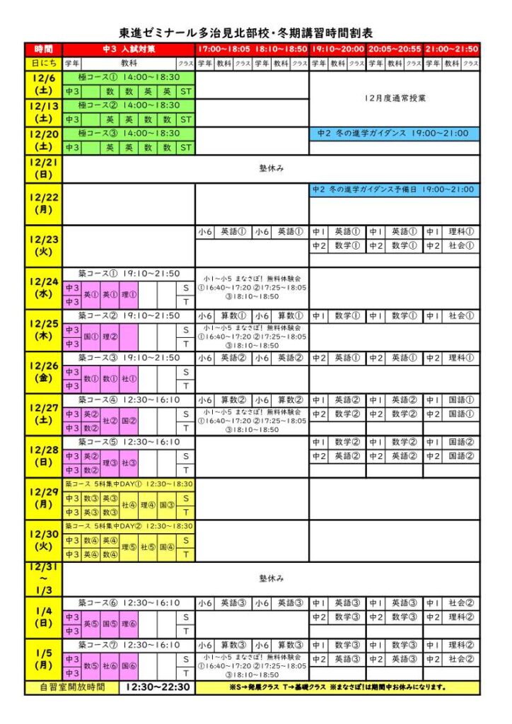 冬期講習 時間割