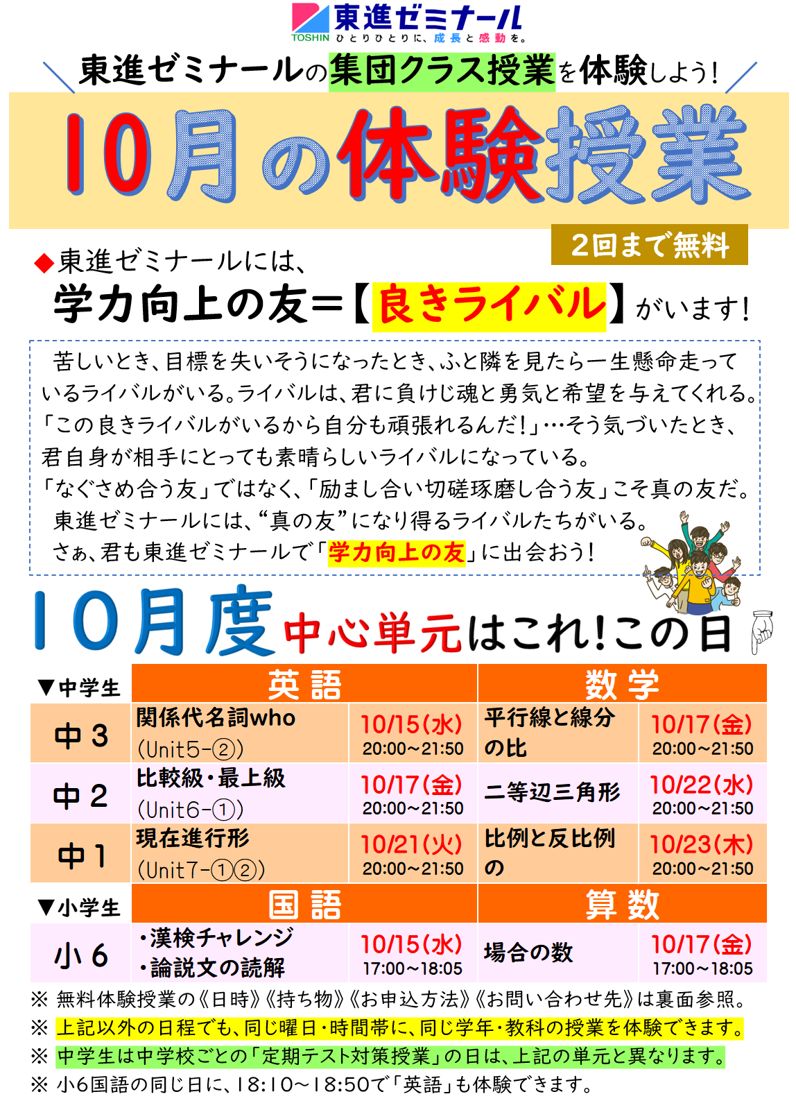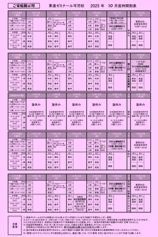 東進ゼミナールの集団クラス授業は、上記の日程以外でも「無料体験授業」に参加できます。くわしくは下の時間割表をご参照ください。*画像タップで拡大表示します。
