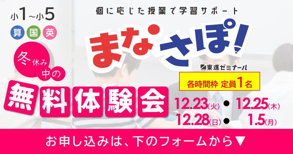 可児市の学習塾・東進ゼミナール可児校では、小学1年生~5年生を対象とした少人数指導コース【まなさぽ!(:まなびサポート)】の1月スタート生を募集しています。