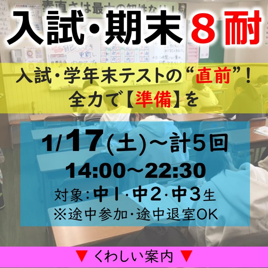 可児市の学習塾、東進ゼミナール可児校(クラス授業)では、中学1年・2年・3年生を対象に1月17日(土)から2月14日(土)までの計5回、【入試・期末8耐】(入試・期末テスト前の8時間勉強会)を開催します。