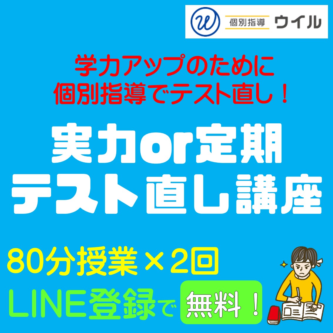 個別指導でテスト直し! 個別指導ウイル 可児校ではテスト直し講座を実施しております。 英語、数学の定期テスト、実力テストのテスト直しを行い、苦手範囲を 克服します。 LINEのご登録で無料で受講できますので、お気軽にお問い合わせください。 個別指導ウイル 可児校 (開講日:月・火・水・金 )