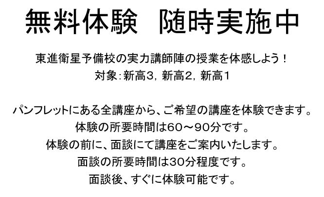 東進衛星予備校多治見駅前校では、映像授業の無料体験随時実施しております。東進の豊富な講座の中から、あなたが興味にあった講座を体験受講することができます。今すぐお申込みください。