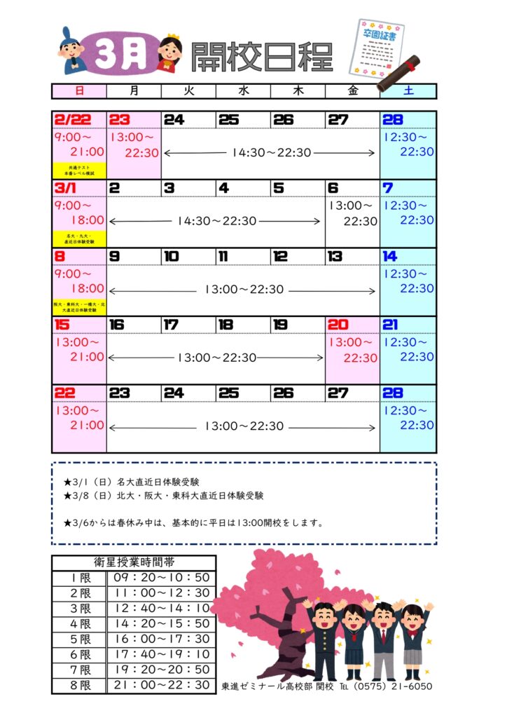 関校高校部 3月開校日程