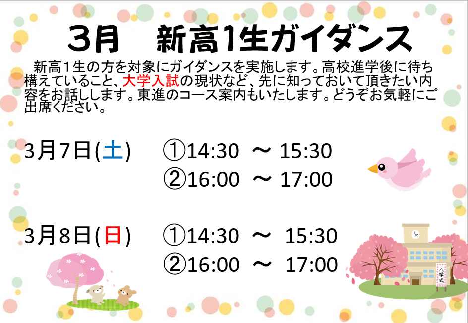3月 新高1生ガイダンス 多治見市にある学習塾、東進ゼミナール高校部 多治見駅前校です。多治見駅前校では新高1生の方を対象にガイダンスを実施します。高校進学後に待ち構えていること、大学入試の現状など、先に知っておいて頂きたい内容をお話しします。東進のコース案内もいたします。どうぞお気軽にご出席ください。 お問合せは多治見駅前校までお願いいたします。*東進衛星予備校 多治見駅前校 *TEL : 0572-25-6202