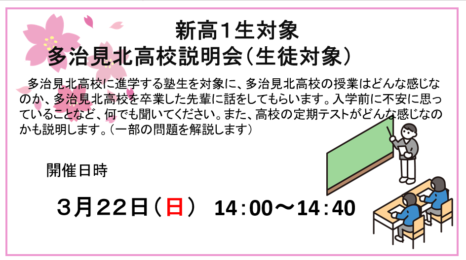 新高1生対象 多治見北高校説明会(生徒対象) 多治見市にある学習塾、東進ゼミナール高校部 多治見駅前校です。 多治見北高校に進学する塾生を対象に、多治見北高校の授業はどんな感じなのか、多治見北高校を卒業した先輩に話をしてもらいます。入学前に不安に思っていることなど、何でも聞いてください。また、高校の定期テストがどんな感じなのかも説明します。(一部の問題を解説します) お問合せは東進多治見駅前校までお願いいたします。*東進衛星予備校 多治見駅前校*TEL : 0572-25-6202