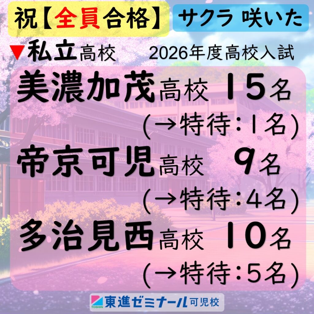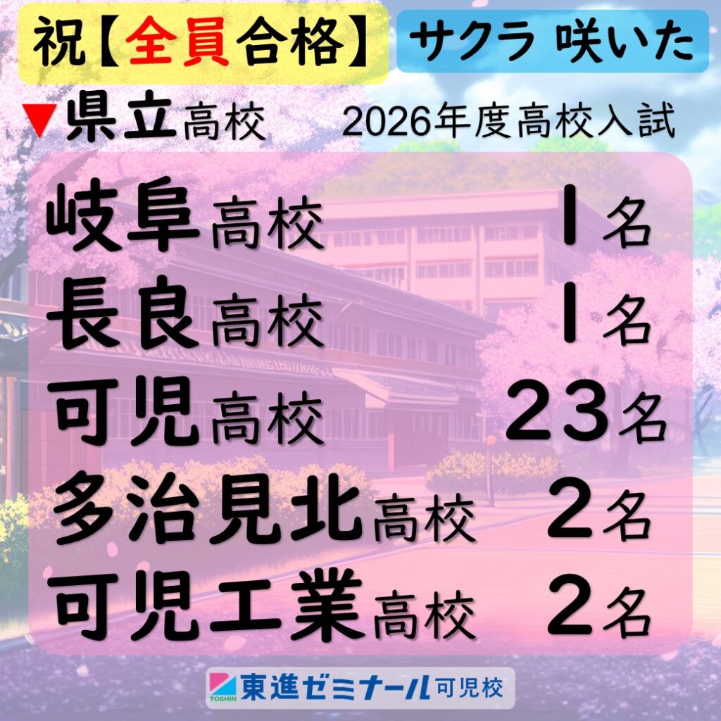 高校入試【全員合格】おめでとう! 可児市の学習塾、東進ゼミナール可児校です。2026年春の高校入試で、塾生および土曜特訓生は受験校への【全員合格】を果たしました!東進ゼミナール可児校での「成長と感動」の実績をご報告します。(「高校進学報告会」参加者の合格実績数) 東進ゼミナール可児校では、ただ今、新年度入塾生・春期講習生を受付中です。「成長と感動」の機会がつまった学び舎であなたもぜひ学力アップを果たしましょう! 集団授業 入塾・体験のお申し込みはこちらから 東進・可児校LINEへ