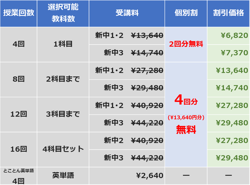 4回、8回、12回など1教科から学習できます。新学年の予習に特化した授業を受講できます。特に新中3生は受験に向けて復習コースと新学年の予習を両立させることもできます!