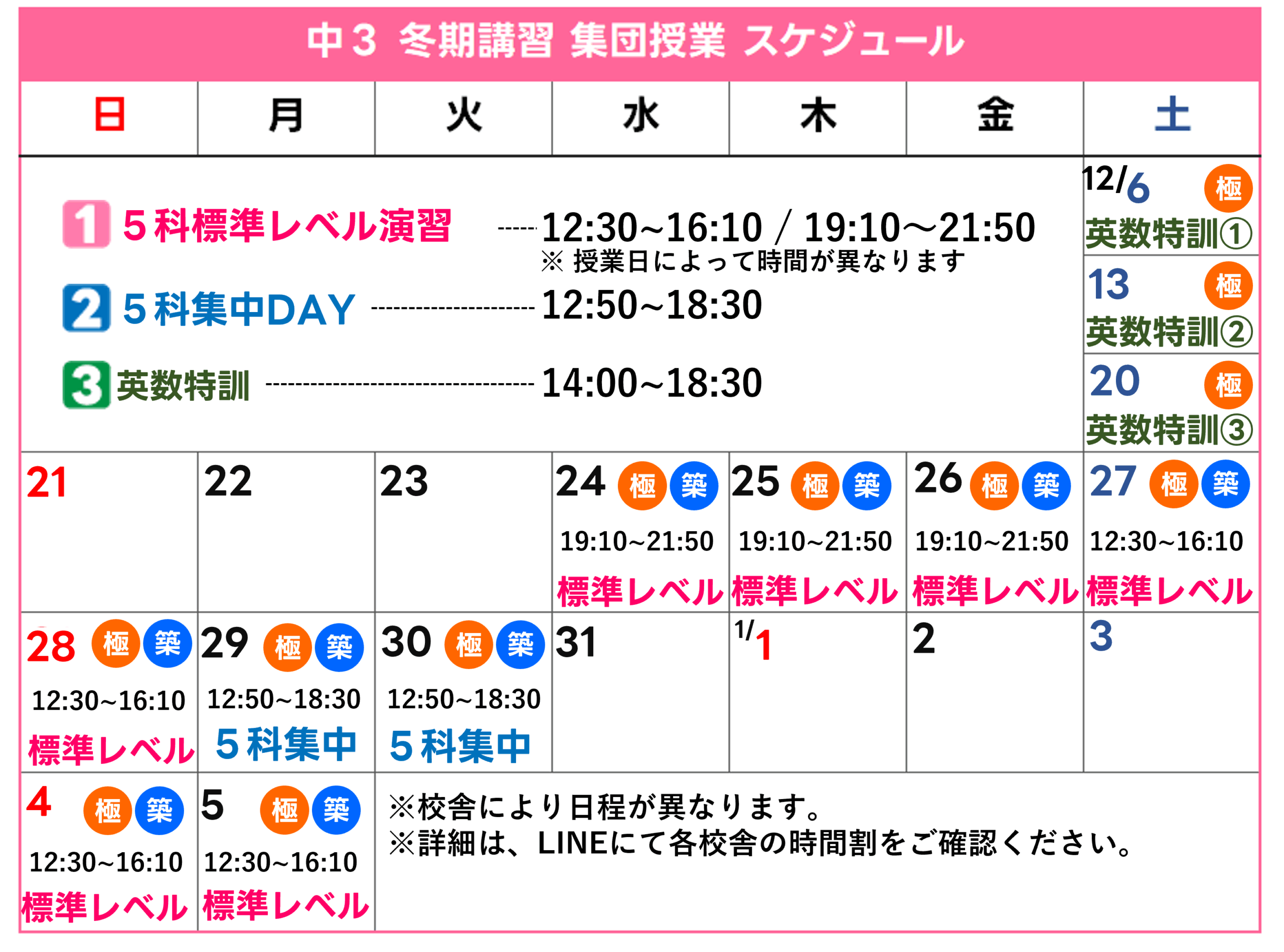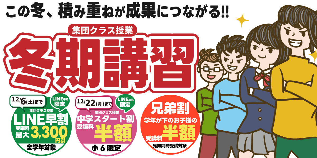 この冬の「冬期講習」を起点に、「受験対策直前講座」と「土曜特訓 第2期」で実戦力と得点力を同時に磨きます。3つの講座が連動することで、学びを止めず、入試本番へ一気にギアを上げていけます。