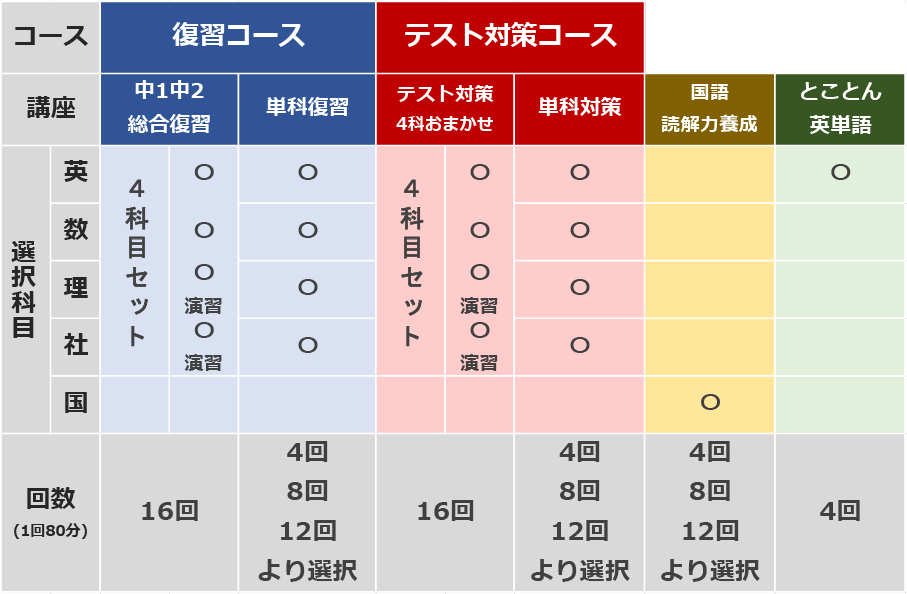 4回、8回、12回など1教科から学習できます。これまでに学習した内容について単元ごとに細かく小テストを行い、間違いが多かった単元に絞って総復習するコースです。基礎を徹底的に理解し、効率よく学力を向上させます。